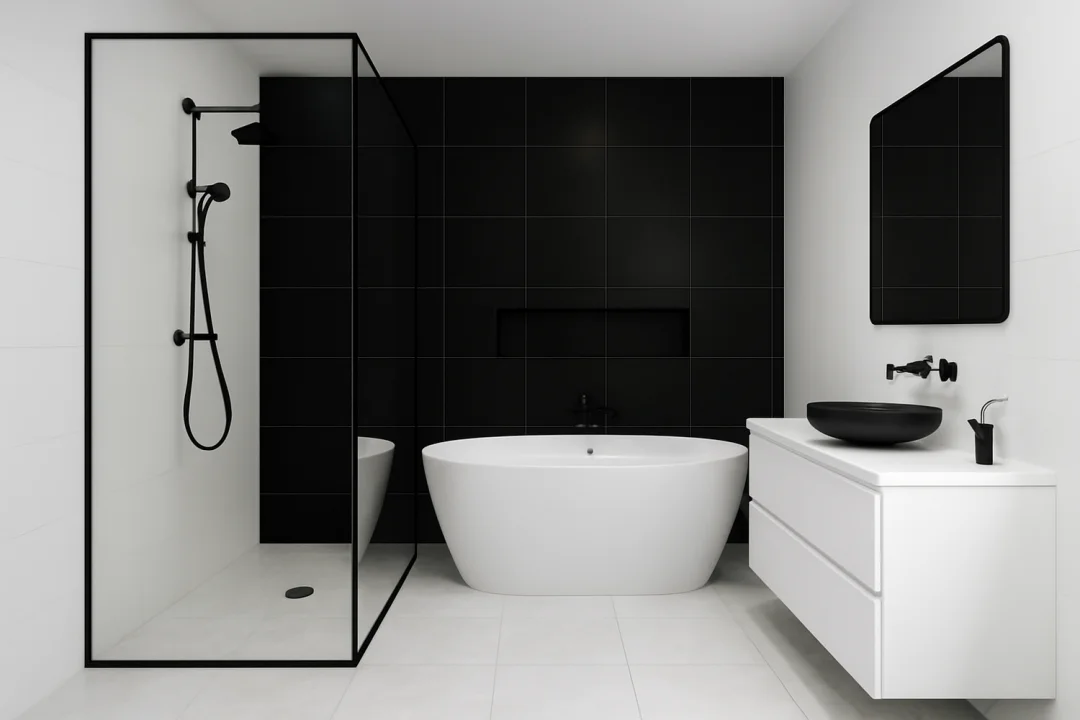 Banyo, monokrom dekorasyonun en etkileyici olduğu küçük alanlardan biri. Beyaz büyük format fayanslar üzerine ince siyah mozaik şeritler eklemek modern bir görünüm yaratıyor. Siyah mat armatürler ve lavabo detayları ile beyaz zemin mükemmel bir kontrast oluşturuyor. Duvara asılan büyük çerçeveli ayna ve siyah-beyaz havlu setleri ise otele benzer bir spa atmosferi sunuyor.